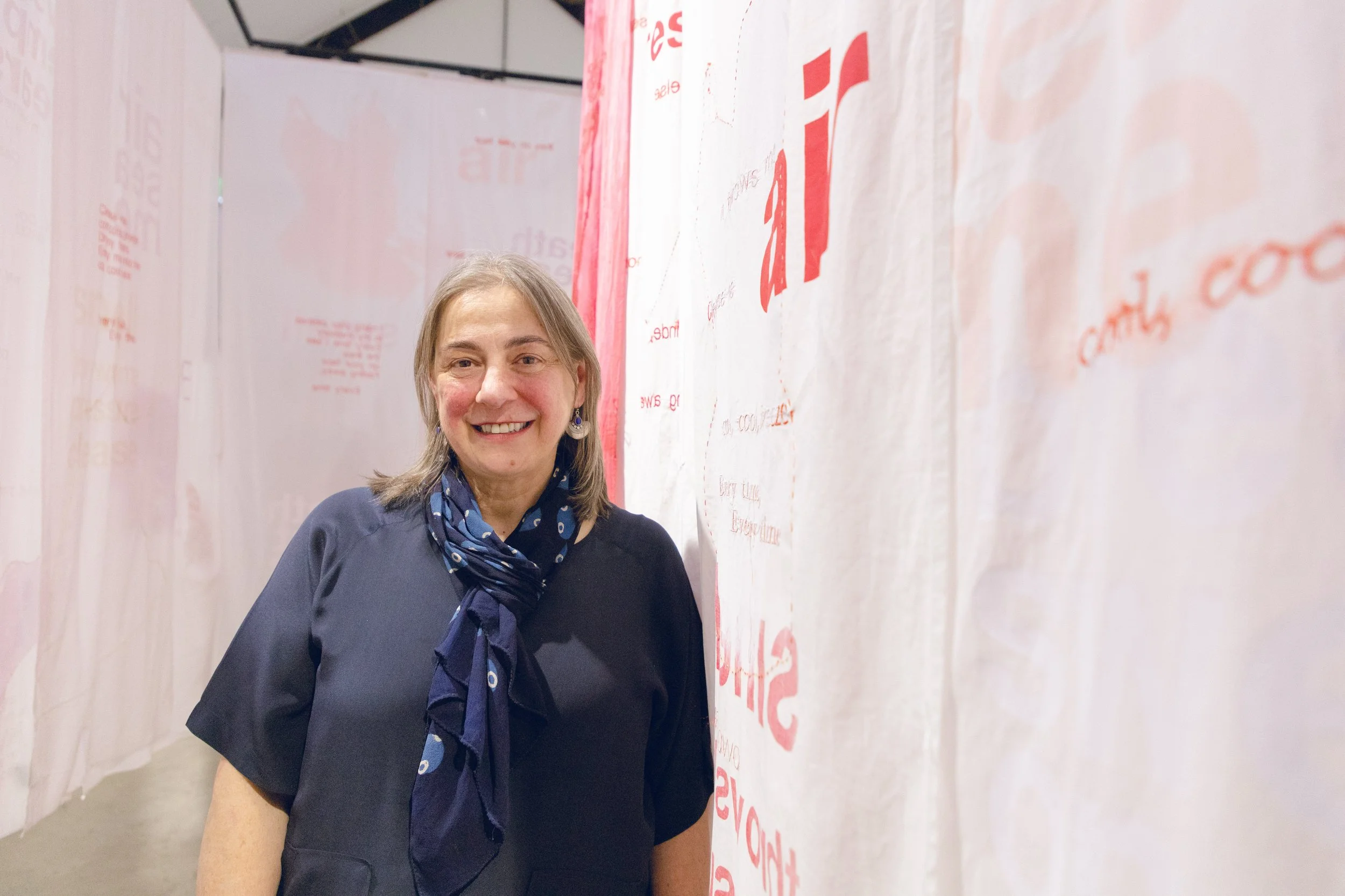 The installation incorporates 42 fabric banners throughout the space, screen printed, hand and machine embroidered with lyrics from the song. Large hand embroidered cushions are available for members of the public to sit on. Members of the public can download the music and lyrics from a QR-Code at the gallery.