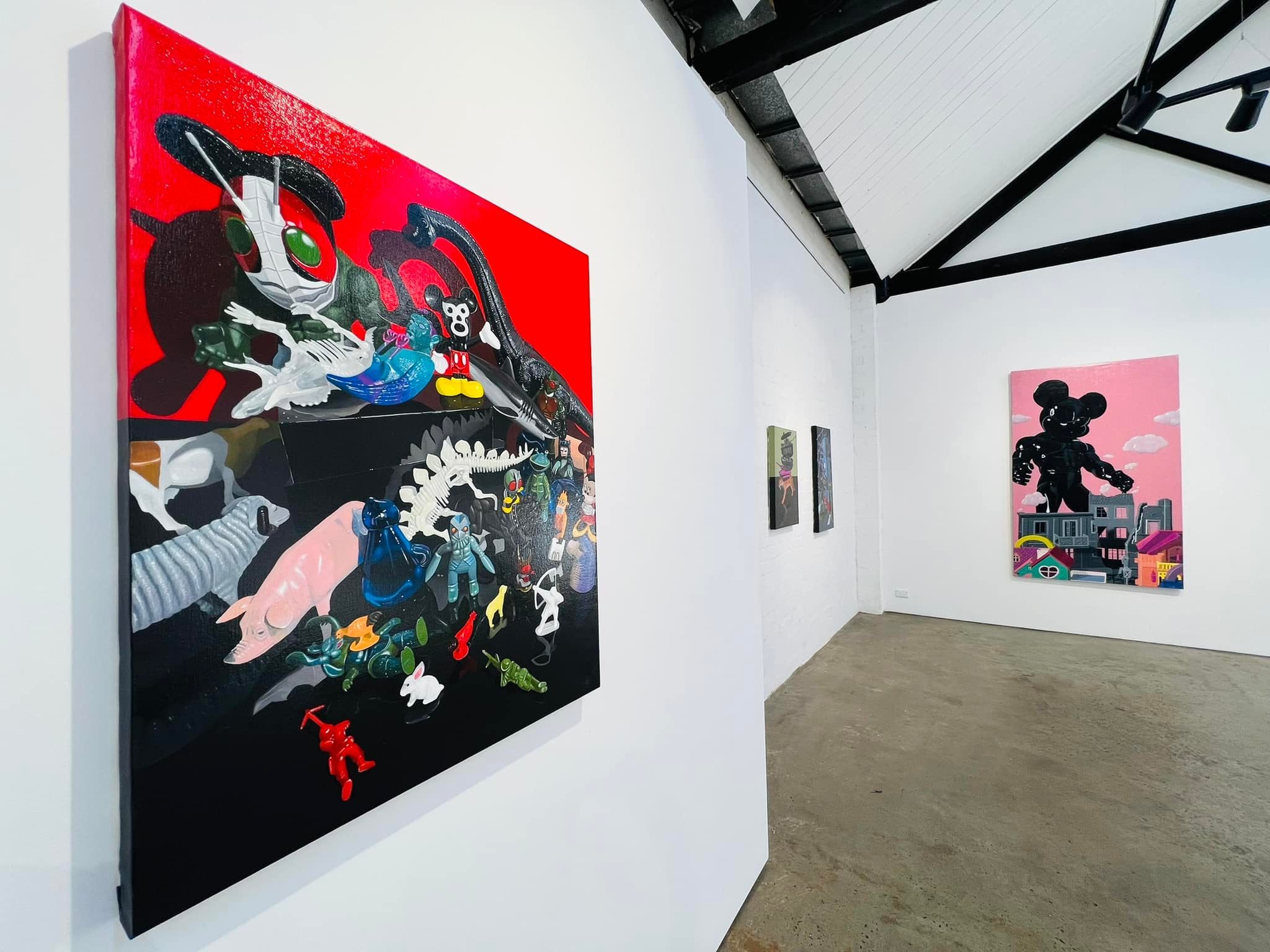 Thai young contemporary artist "Peerapol Aintoom", Peerapol’s works intend to take us to the early day of his action play. The appearance of many characters from different stories creates the communal gathering between heroes, villains and monsters. The surreal assembly of action figures are put together with brightly colourful background. It presents the make-believe toy land as a mirror to our social and political conditions. The artist projects his day-dreaming state of mind into a perversive eye-catching mise en scène.The works post some questions to the originality of his imaginations, values and the social truth that he come to know. These paintings are produced in dreamlike state while the artist is fully awake.