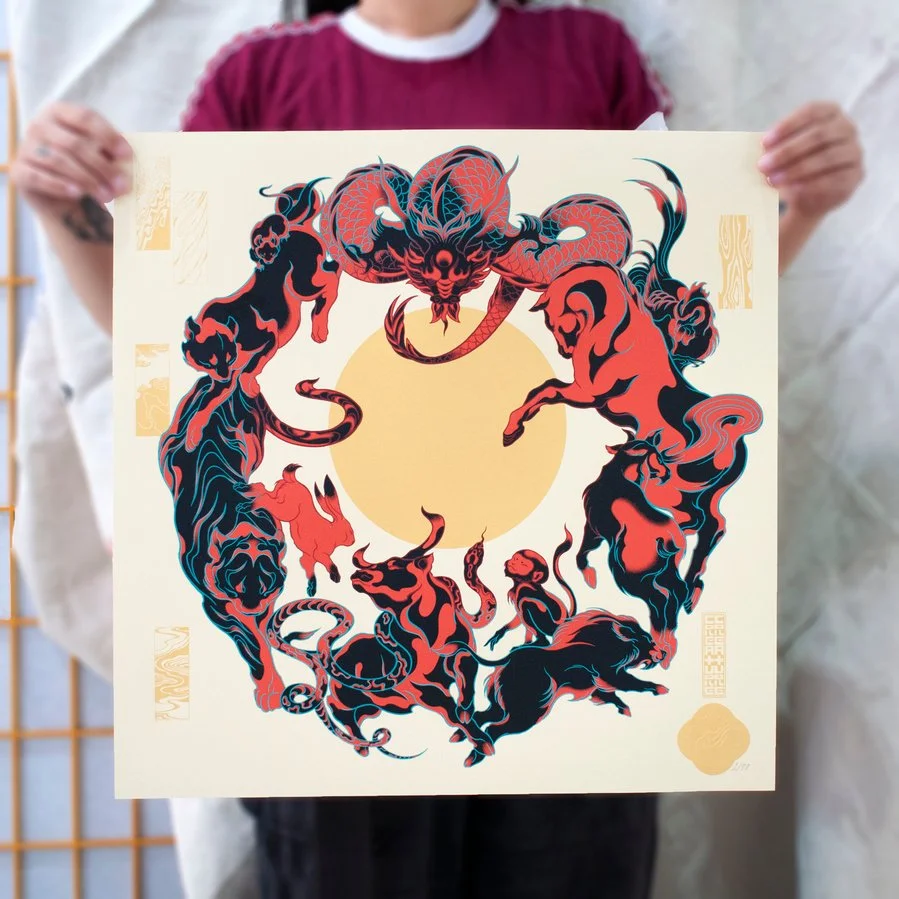 The folklore, mythology and culture connected with the Chinese zodiac has always sparked such powerful visual inspiration for us. In this print we have included all twelve animals linked in a circle as well as the five nature elements fire, water, wood, metal and earth, which are significant in Chinese philosophy. A creation, or generating system to explain many phenomena.