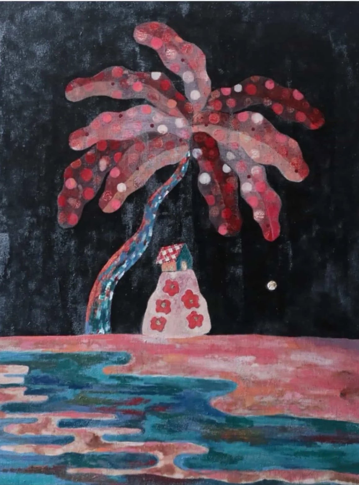 Gabby’s work is inspired by traditional Asian art forms such as Minhwa, Ukiyo-e, and Ottchil, combined with elements of Western Surrealism and Minimalism. She blends these influences into a unique style she calls “Abstract Formative.”
